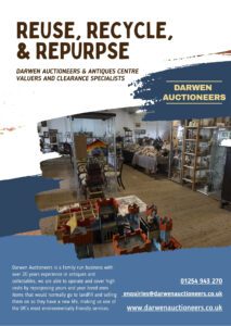 Darwen Auctioneers REUSE, RECYCLE, & REPURPOSE Darwen Auctioneers & Antiques Centre Valuers and Clearance Specialists Darwen Auctioneers is a family run business with over 20 years’ experience in antiques and collectables. We are able to operate and cover high costs by repurposing yours and your loved ones’ items that would normally go to landfill and selling them on so they have a new life, making us one of the UK’s most environmentally friendly services. Telephone: 01254 943 270 Email: enquiries@darwenauctioneers.co.uk Website: www.darwenauctioneers.co.uk ...