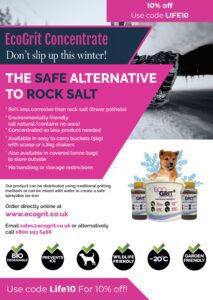 EcoGrit Concentrate Don’t slip up this winter! THE SAFE ALTERNATIVE TO ROCK SALT • 80% less corrosive than rock salt (fewer potholes) • Environmentally friendly (all natural/contains no urea) • Concentrated so less product needed • Available in easy to carry buckets (5kg) with scoop or 1.2kg shakers • Also available in covered tonne bags to store outside • No handling or storage restrictions Our product can be distributed using traditional gritting methods or can be mixed with water to ...