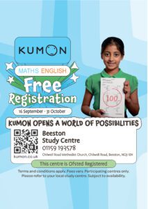 Kumon- Maths and English Free Registration 16 September-31 October Kumon opens a world of possibilities. Beeston Study Centre 01159 193578 Chilwell Road Methodist Church, Chilwell Road, Beeston, NG9 1EH This centre is Ofsted Registered. Website: kumon.co.uk Terms and conditions apply. Fees vary. Participating centres only. Please refer to your local study centre. Subject to availability ...