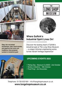 The Long Shop Museum Where Suffolk’s Industrial Spirit Lives On! Discover the beating heart of Suffolk’s industrial past at The Long Shop Museum – a unique Victorian engineering works turned vibrant heritage experience! Step into recreated workshops, hear local stories, and explore the tools and traditions that powered Leiston’s industrial past. UPCOMING EVENTS 2025 • Polling Day – Museum CLOSED – 2nd October • Works in Wartime – 19th October • Final Fling! – 2nd November Telephone: 01728 832189 Email: info@longshopmuseum.co.uk ...