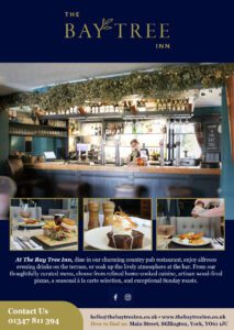 The Bay Tree Inn At The Bay Tree Inn, dine in our charming country pub restaurant, enjoy alfresco evening drinks on the terrace, or soak up the lively atmosphere at the bar. From our thoughtfully curated menu, choose from refined home-cooked cuisine, artisan wood-fired pizzas, a seasonal à la carte selection, and exceptional Sunday roasts. Contact Us Telephone: 01347 811 394 Email: hello@thebaytreeinn.co.uk Website: www.thebaytreeinn.co.uk Address: Main Street, Stillington, York, YO61 1JU ...